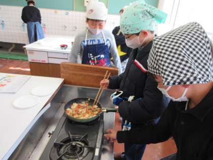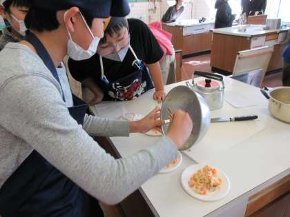 班で事前に栄養のバランスを考えて、1食分の献立を工夫し調理実習に取り組んでいました。楽しい調理実習の時間は、協力し合いながらどの班もおいしく出来上がりました。