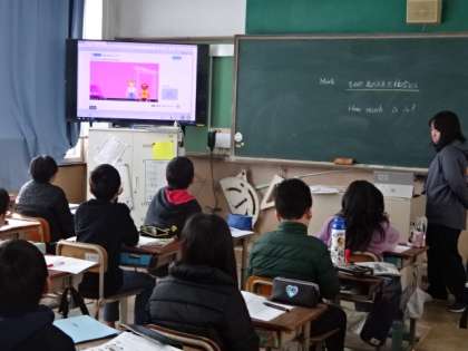 外国語の時間の様子です。高学年は、これまで培ってきた語彙を使って、コミュニケーションをとることも大事にしています。