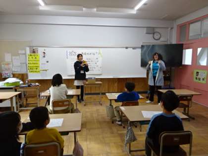 今日はALTの先生と一緒に学習です。宝さがしゲームやカードを使っての学習を、みんなで楽しく取り組んでいました。
