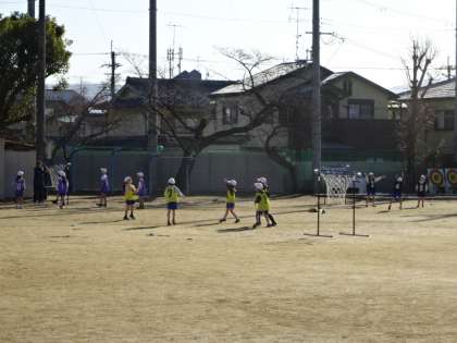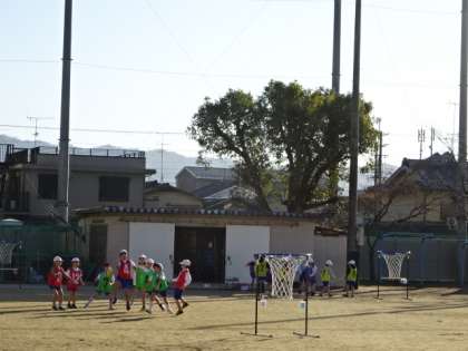 パスゲームの学習です。チームでパスをつないで、ゴールを目指します。チームで声をかけ合いながら、元気に活動しています。