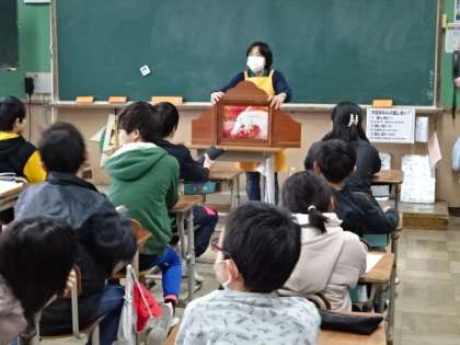 今日は5・6年生の教室で朝の読み聞かせをしていただきました。紙芝居を読み聞かせていただいたクラスもありました。