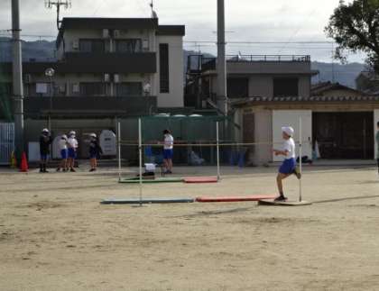 走り高跳びの学習です。自分の記録を少しでも伸ばせるように、助走のタイミングをはかっています。寒い中ですが、元気に活動しています。