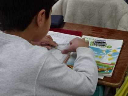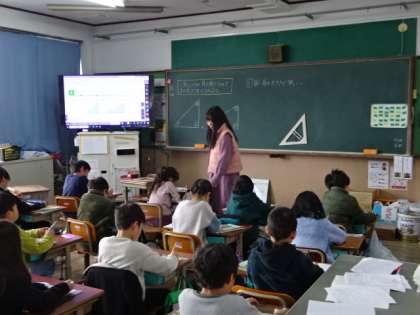 図形の学習です。三角形の特徴を、三角定規も使いながら調べています。