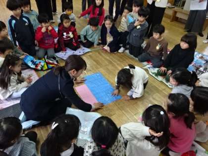 「大きさくらべ(2)」の学習で、今日は広さくらべをしました。それぞれ家から持参したレジャーシートを広げて、大きさくらべをする1年生。広さの感覚を友達と交流する中で、実感していました。