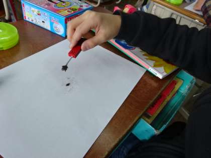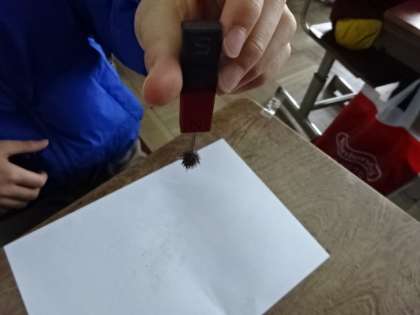 磁石を使っての学習です。今日は砂鉄を磁石に吸い付く様子を観察しました。何度も繰り返し砂鉄を磁石に吸い付けていて、みんな楽しそうです。