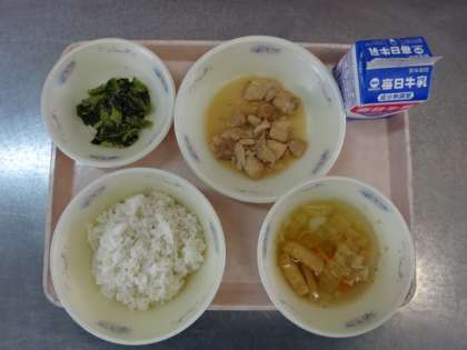 今日の献立は、「麦ごはん・牛乳・鶏肉のあまから煮・小松菜のごまいため・キャベツのすまし汁」でした。調理員さんも絶賛のあまから煮は、子どもたちも大喜び。食がすすみます。今日も美味しい給食、ごちそうさまでした!