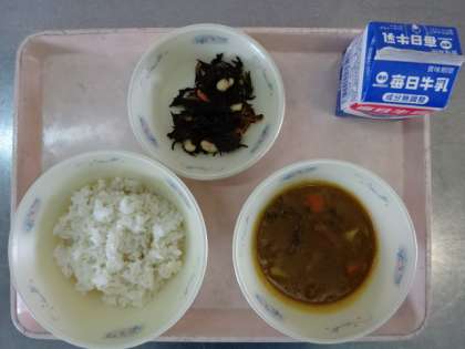 今日の献立は、「麦ごはん・牛乳・カレー・ひじきのソテー」でした。カレーは子どもたちに一番人気のある献立です。今年度最後のカレー。6年生にとっては最後のカレー、しみじみと味わいました。今日も美味しい給食、ごちそうさまでした!