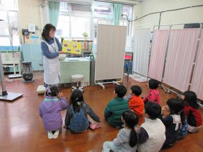 上賀茂幼稚園の年長組の園児さんたちが、保健室に来てくれました。小学校の保健室についてのお話や絵本の読み聞かせをしました。園児さんたちは、興味津々でしっかりお話を聞いてくれました。そして、身長・体重を測りました。