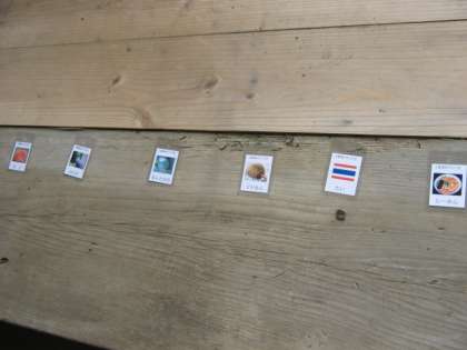 答えのカードを置いておきます。食べ物や国旗,鳥やそのほかの生き物などが書かれています。