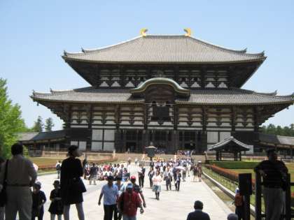 東大寺はとても大きいです。東大寺を出ると,鹿がいっぱい寄ってきました。いっぱい触って,みんなで記念撮影をしました。運慶,快慶作の「あうん像」があります。