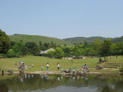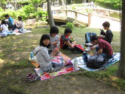 東大寺を後にして,次はグループで奈良公園を散策です。正倉院などを見て歩きました。お昼になり,待ちにに待ったお弁当の時間です。みんなでおいしくいただきました。食後は、しばらく芝生の公園で遊びました。若草山が見えます。