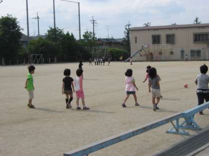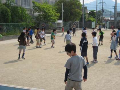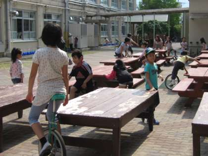 2年生の子どもたちは,ドッチボールで楽しく遊んでいます。中庭では,ベンチを利用して一輪車で遊んでいる子もいます。始業前の楽しいひと時です。