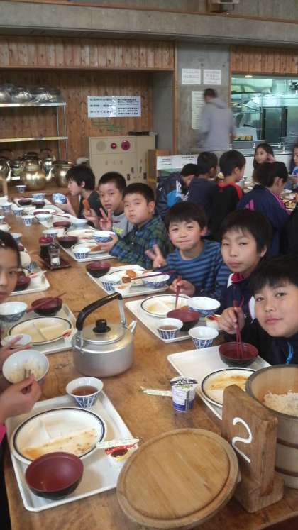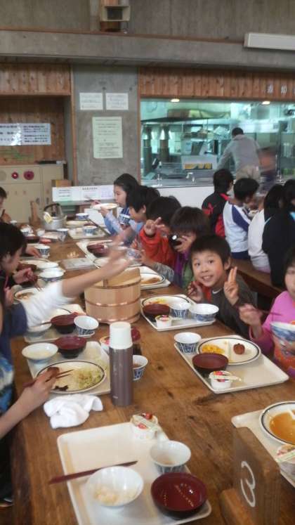夕食の様子です。花脊山の家は緑がとてもきれいですがすがしい空気です。みんな、時間も守って元気に行動しています。