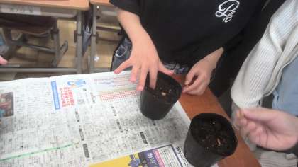 4年生は理科の学習でツルレイシの種撒きのやり方を学習しました。
