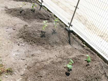 学校の畑にミニトマト、きゅうり、ナス、ピーマンの苗を植えました。