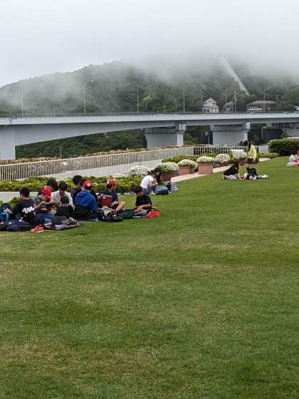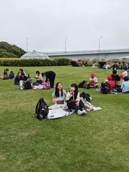芝生広場で昼食のスタートです。今回はいろいろなメンバーで食べてます。