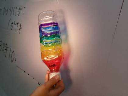 卵のパックやペットボトル等にマーカーで色を塗って光を通すことで色が様々な場所に写ることを学習しました。