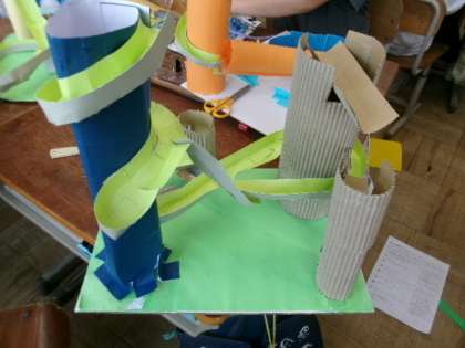 図画工作科の学習でビー玉を転がして遊ぶための工作をしています。それぞれの子ども達が試行錯誤しながら自分の作ったコースを上手に転がるように作っていました。