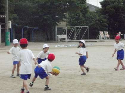 1年生は1組から3組まで運動場でころがしドッチボールを行いました。