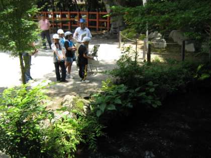 1.上賀茂神社の中を流れる「ならの小川」で中本理一自治連合会長から説明を受ける子どもたちです。この「ならの小川」が「明神川」になります。