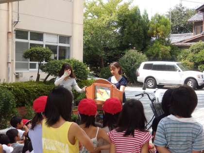 今日の中間休みはのほほんの会による自転車紙芝居でした。運動会の練習で忙しい中、みんな集まって来ていました。