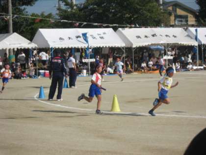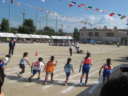 10月7日(日)晴天のもと,上賀茂小学校グランドで第57回上賀茂学区民体育祭が行われました。上賀茂小学校児童も多数参加し,活躍しました。町内対抗児童リレーでは,低学年から高学年,男女混合の1チーム10名で,午前に予選,午後に決勝が行われました。どの子も町内の代表として力走しました。