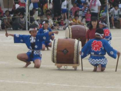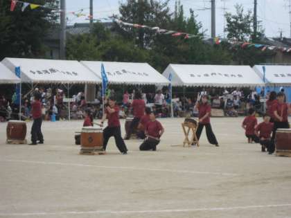 お昼の中間得点発表前には,上賀茂小学校和太鼓クラブ&PTA和太鼓クラブ「奏(かなで)」のみなさんによる和太鼓演奏がありました。和太鼓クラブ児童は、曲名「三宅太鼓(みやけだいこ)」を,PTA和太鼓クラブ「奏」のみなさんは「空音(くおん)」を迫力満点で演奏してくださいました。