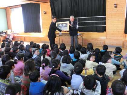 3月12日(火)に上賀茂社会福祉協議会様に作っていただきました上賀茂大洪水「水禍」の贈呈式とお披露目が上賀茂小学校の多目的室で行われました。まず,社会福祉協議会会長の中島龍一様より紙芝居の贈呈が行われました。この紙芝居は地域の方が70年前に起こった賀茂川の氾濫で上賀茂地域が洪水にみまわれ,付近住民が命からがら逃げ,地域の方が力を合わせて住民を守った。という実話をもとに作られています。紙芝居の絵は画家の方が描いてくださり,当日は劇団の方が紙芝居を朗読してくださいました。
