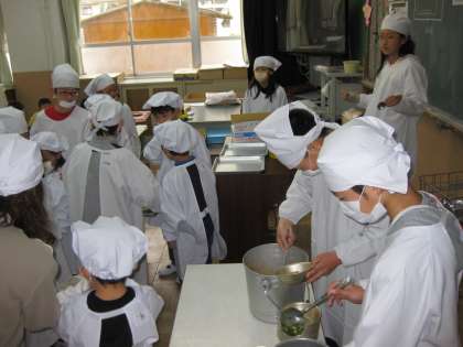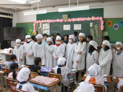 1年生にとって、今日は初めての給食でした。期待して待っている子、ちょっと不安そうな子・・・ でも、今日のメニューはみんなが大好きなスパゲティーです。