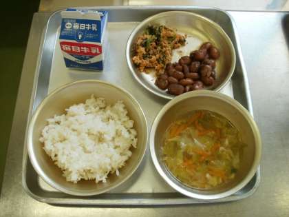 今日の給食は,胚芽米ごはん,牛乳,金時豆の煮豆,キャベツの吉野汁でした。