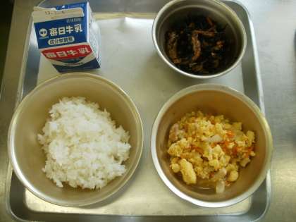 今日の献立はごはん・牛乳・親子煮・にじきのにつけ・じゃこでした。