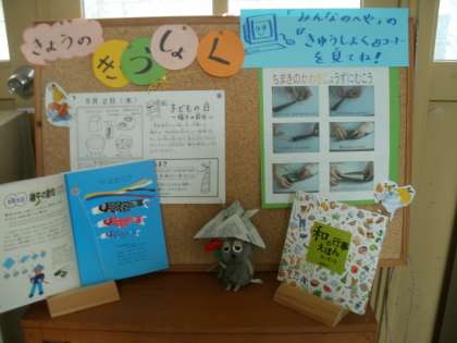 上賀茂学校図書館の前には給食のコーナーをもうけています。