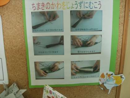 今日の献立はむぎごはん・牛乳・鶏肉のこはくあげ・ほうれんそうのおかか煮・すまし汁・ちまきでした。