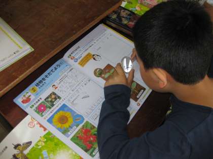 虫眼鏡で、じっくりと観察しているのは、色々な植物の種です。種には、いっぱい秘密が隠されています。しっかりと見つけてみよう。