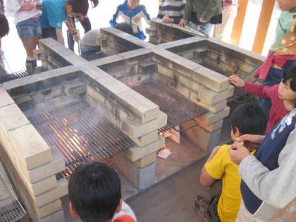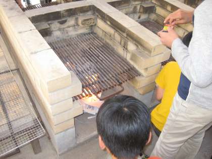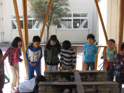 4年生は、中庭にあるかまどでゴミを燃やしていました。社会科だそうです??きっと、学習問題づくりかな??