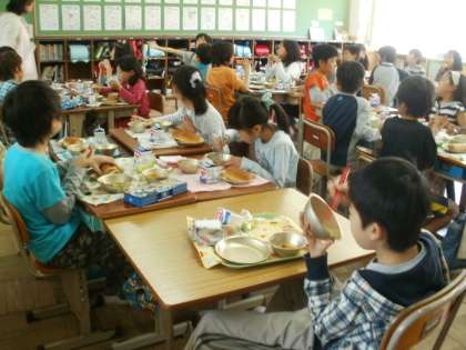 今日は,4年生が給食交流をしました。4年2組の教室で一緒にご飯を食べました。一緒に仲よく食べていました。