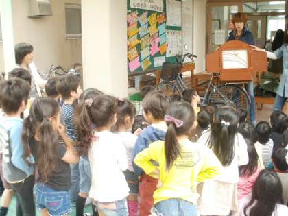 中間休みに,今年度初めての自転車紙芝居がありました。