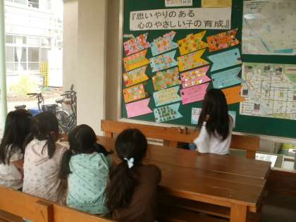 朝会で発表したクラスの目標を,職員室前の掲示板にはりました。