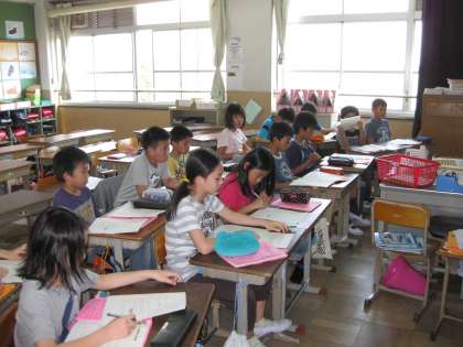 5年1組の教室ではレクレーション係がキャンプファイアーの打合せをしています。思い出に残るキャンプファイアーをお願いします!!