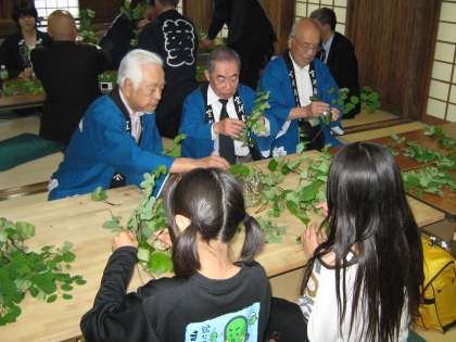 葵かづらにフタバアオイの葉をからませて,作っていきます。