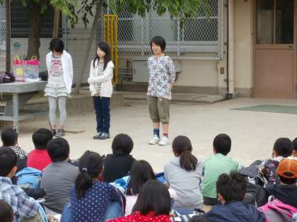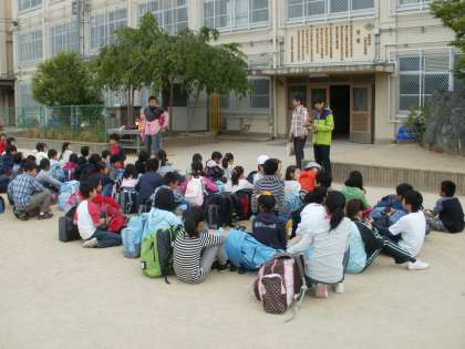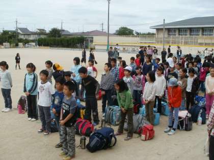曇り空の中 5年生 80名 全員元気に登校しました。