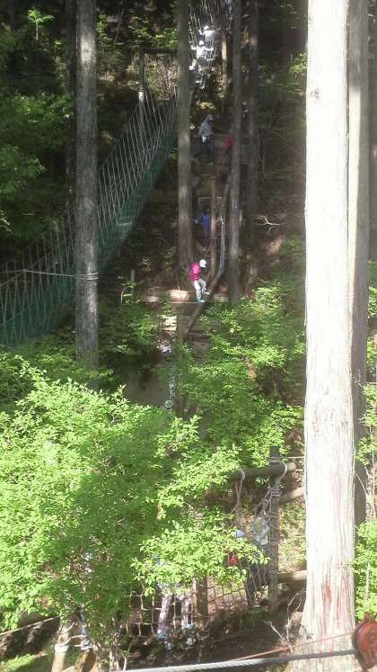 山の斜面・谷間・森の中にあるアスレチック 難しいものもあります。