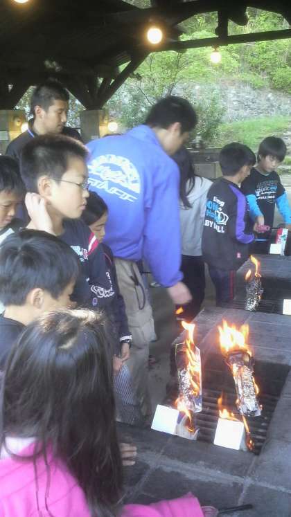 そのまま,かまどに入れます。牛乳が燃え尽きると,ちょうどいい具合にパンが焼け,