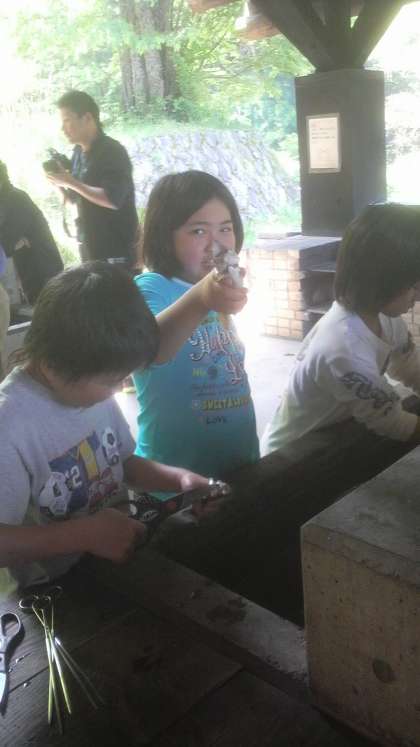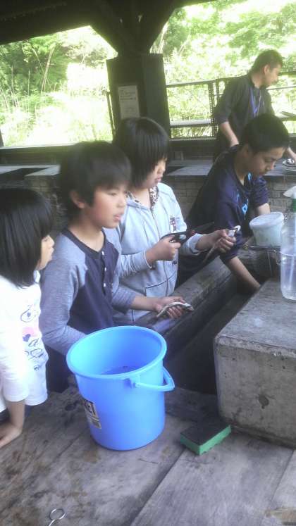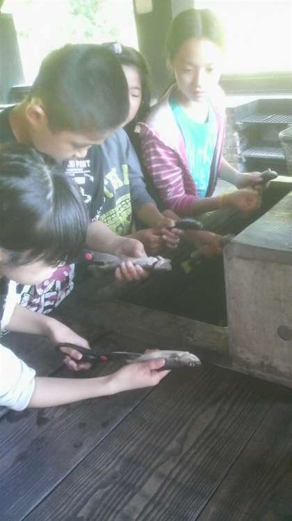 晴天のもと,オガマ池で魚つかみをしました。その後、魚をさばいて、炭火焼きです。