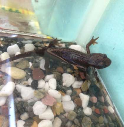学校には,毎日のように子どもたちが生き物を持ってきてくれます。左のカエルは,オタマジャクシから成長したものです。まだ小さくて体長1cmくらいです。右は,今日から仲間入りしたイモリです。