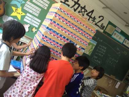 1日に使う水の量(1人あたり)を分かりやすいように牛乳パックであらわしてみると,とても大量の水を使っていることが分かりました。その後,きれいな水がどこから来るかを調べました。