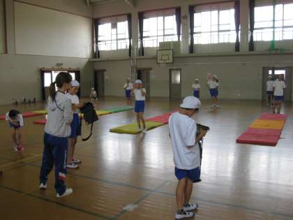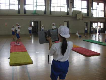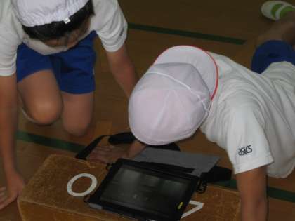 体育館で6年生がマット運動をしていました。なにやらいつもと少し違います。タブレットでマット運動の様子を動画におさめ、すぐにそれを再生して自分の動きを振り返っています。こんな使い方もできるんですね・・・!