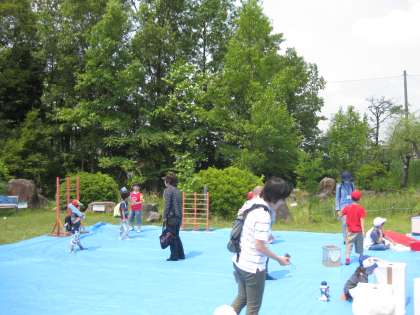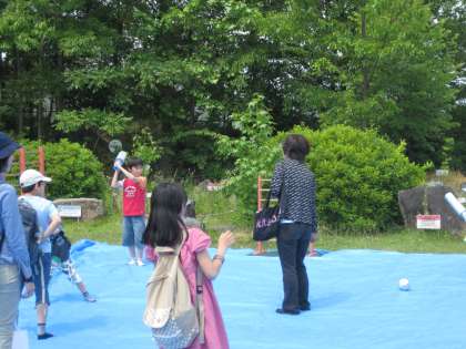 高学年の実験と低学年の展示学習が終わって、次はプラネタリウムです。入れ替わりの時間を中庭で楽しく過ごしました。イモリやヤドカリとふれ合えるコーナーや、工夫した道具で野球やフリスビーもしました。