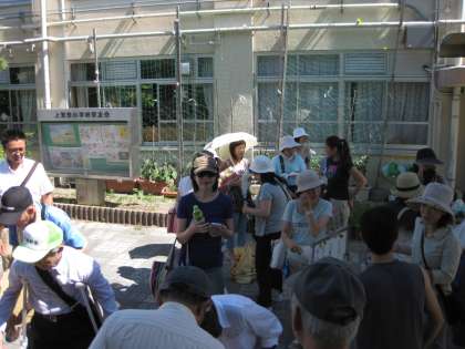 3年生の総合的な学習「この町大好き上賀茂探検」の学習のいっかんとして、4年前から始まりました。地域の方々が、上賀茂校区内の名所15カ所で3年生がまわってきたら、その場所のことを説明されます。それを、3年生の子どもたちは、しっかり聞いて必要なことを書いていきます。