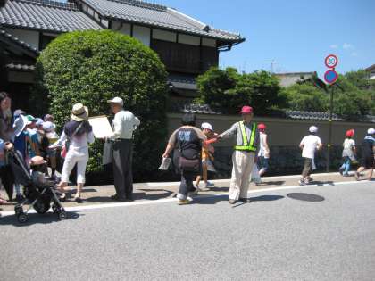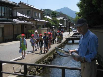 社家町のポイントにきました。いつも何気なくこの前を通っている子どもたちですが、説明を聞いて・・・
